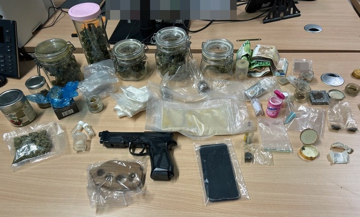 Im Rahmen der Wohnungsdurchsuchung fanden die Einsatzkräfte 400 Gramm Amphetamin, 200 Gramm Haschisch, 120 Gramm Marihuana, 5 Gramm MDMA in kristalliner Form, 60 Tabletten Ecstasy, 980 Euro Bargeld, einen Schlagring sowie eine Softairpistole. Daher ordnete die Staatsanwältin in der Folge die Vorführung des 34-jährigen an.