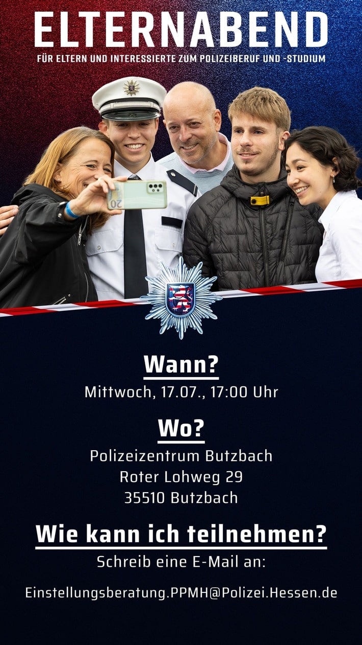 Komm‘ zu uns in das moderne Polizeipräsidium nach Offenbach. Wir bieten erstmalig eine Infoveranstaltung für Dich, Deine Eltern oder einer nahestehenden Person an. Während der kurzweiligen Infoveranstaltung sprechen Polizeihauptkommissarin Jennifer Mlotek und Polizeihauptkommissar Christopher Wenzel über Chancen und die Vielfalt im Polizeiberuf und zeigen im Rahmen einer Führung deinen möglichen künftigen Arbeitsplatz.