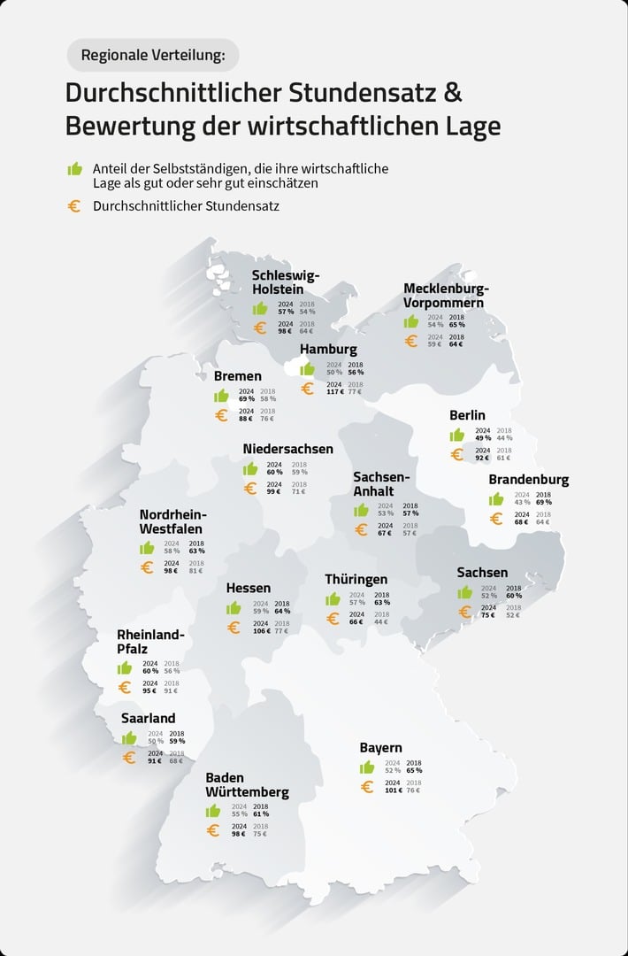 Die größte Veränderung wird im Bundesland Brandenburg sichtbar: Der Anteil derer, die die wirtschaftliche Lage ihres Unternehmens im Jahr 2018 als gut bis hervorragend eingeschätzt haben, hat sich heute verringert: Waren 2018 noch 69 Prozent der Selbstständigen sehr zufrieden mit ihrer wirtschaftlichen Situation, sind es heute nur noch 43 Prozent. Damals war Brandenburg das Bundesland mit den meisten Selbstständigen, die ihre wirtschaftliche Lage als mindestens gut beurteilt haben. Heute ist es das Schlusslicht.